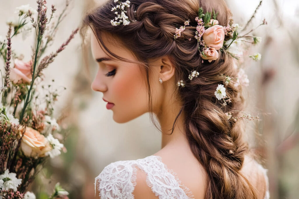 Version modernisée du classique, le chignon bas déstructuré apporte une touche de douceur et de naturel. Laissez échapper quelques mèches autour du visage pour un effet romantique. Idéal avec des accessoires discrets comme des fleurs fraîches ou un voile court, ce style s’accorde parfaitement avec les robes dos nu ou les silhouettes bohèmes.